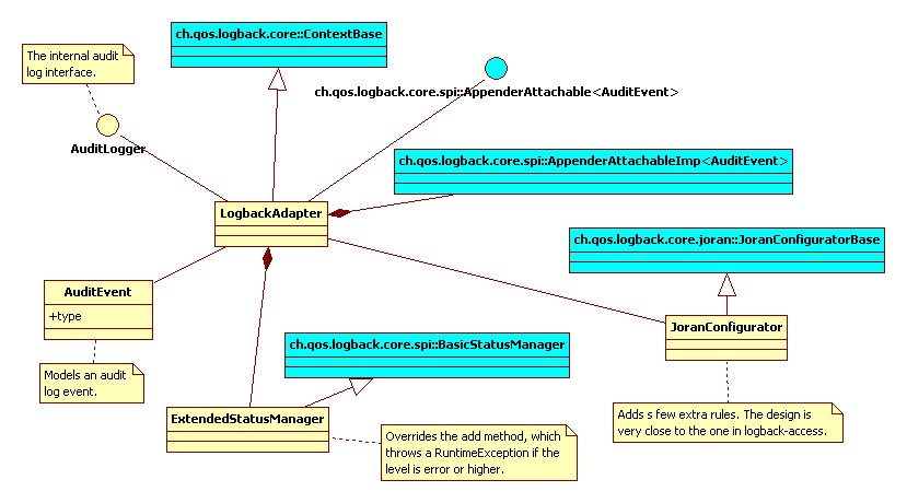 Attached is a UML class diagram of the basics of the audit logger implementation utilizing Logback. As you can see it's not very complicated. What I have left out is most of the Joran configuration parts (you don't need to use Joran for configuration if you don't want to) and our extension of PatternLayoutBase (which uses a bunch of Converters specific to our case).