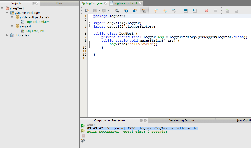 Thank you for the suggestion....Unfortunately, I get the same result.... 09:49:47.151 [main] INFO logtest.LogTest - hello world I followed your directions with the exception of naming the class HelloWorld. I named it LogTest. When I right clicked on Source Package and added new xml file, Netbeans created the <default package> folder on its own. I'm attaching two screen shots of my netbeans setup. The first screen shot is LogTest.java and the second is logback.xml. Thanks, Roger