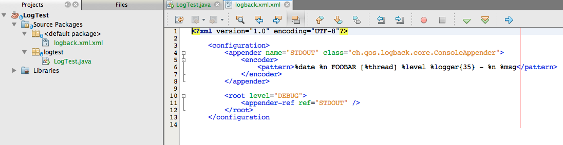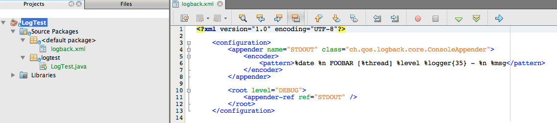 Try my exact steps to create that project: 1. Create a new Java project in Netbeans (or Eclipse...same steps here work). 2. Create a class named "HelloWorld", and copy this code into it: package helloworld; import org.slf4j.Logger; import org.slf4j.LoggerFactory; public class HelloWorld { private static final Logger LOG = LoggerFactory.getLogger(HelloWorld.class); public static void main(String[] args) { LOG.info("hello world!"); } } 3. Create a file named logback.xml in the src directory (do not put it under src/helloworld or any other subdirectory). Copy the following into the file: <configuration> <appender name="STDOUT" class="ch.qos.logback.core.ConsoleAppender"> <encoder> <pattern>%date %n FOOBAR [%thread] %level %logger{35} - %n %msg</pattern> </encoder> </appender> <root level="DEBUG"> <appender-ref ref="STDOUT" /> </root> </configuration> *You can actually put logback.xml into any directory specified by the run.classpath property in ${project.dir}/nbproject/project.properties. We used src here only because it's quick and easy.* 4. Build and run the project.