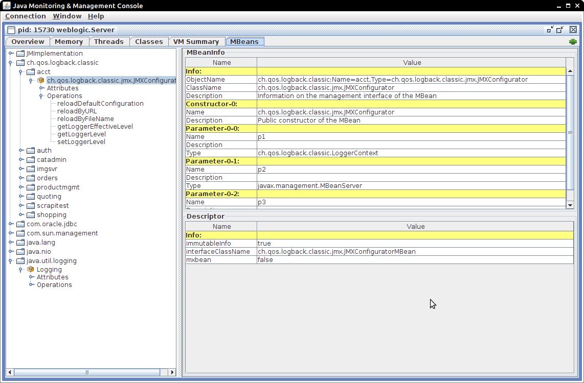 Help please. I am deploying my application in weblogic server 12. I have my application configured with the jmxConfigurator. In my development environment I have disabled jmx remote authentication with the following java args: -Dcom.sun.management.jmxremote -Dcom.sun.management.jmxremote.port=9999 -Dcom.sun.management.jmxremote.ssl=false -Dcom.sun.management.jmxremote.authenticate=false With this configuration I can connect to a running weblogic process using jconsole. Within this tool there is an MBeans tab and from there I can navigate to a node named "ch.qos.logback.classic" and I can see and modify my application's logging configuration. This works great for development. When I go to production I want to provide a way for the CM/Support team to administer the configuration at runtime. However, I can not disable jmx remote authentication for this scenario. Also, I don't think I'll be able to use jconsole in this environment. I will be able to use weblogic's WLST tool though. The problem is that I can't find or configure the MBeans within the WLST tool. Attached is a screen shot of jconsole, within which I can modify the configuration. Then below, I will show some of my failing in wlst: